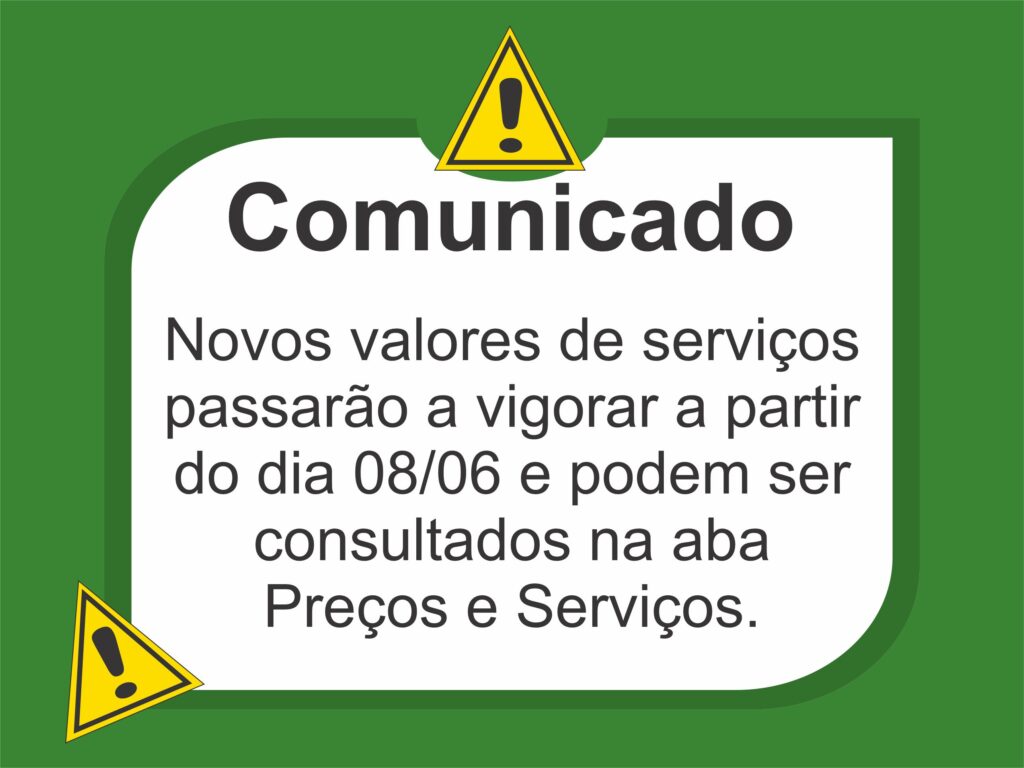 Novos valores de serviços passarão a vigorar a partir do dia 08/06/2025 e podem ser consultados na aba Preços e Serviços.
